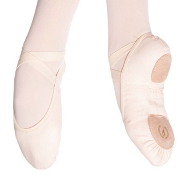 Split-sole canvas ballet shoes feature pre-sewn criss-cross elastics that are ready to wear, smooth suede soles for easy gliding, and an elastic arch casing that enhances the shape of your foot. Brushed cotton lines these ballet shoes for soft, breathable comfort while the multiway stretch canvas wraps around your foot for a sock-like fit. The flattened pleating under the metatarsals adapts to various shapes, and the slightly tapered outer sole padding creates a cleaner heel-to-toe line. A comfortable, drawstring-free elastic binding wraps around the shoe opening for a streamlined look and secure fit.